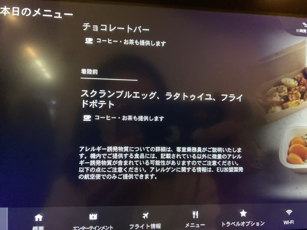 何回もフライト情報やら、メニューやらをやたら見てました。フライト情報の地図の矢印を見てたら、北極圏を通過してなかったので、通過証明書も配布されませんでした。