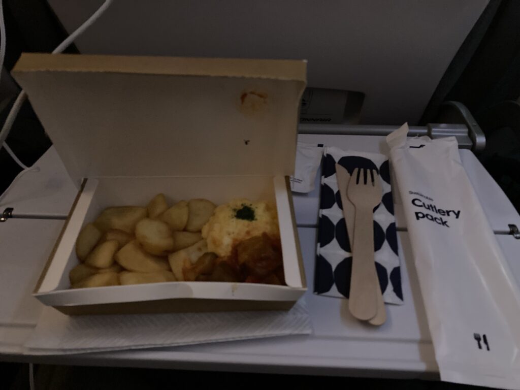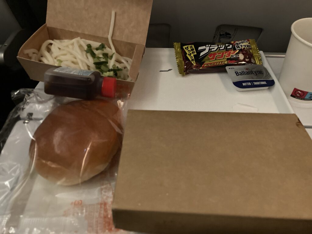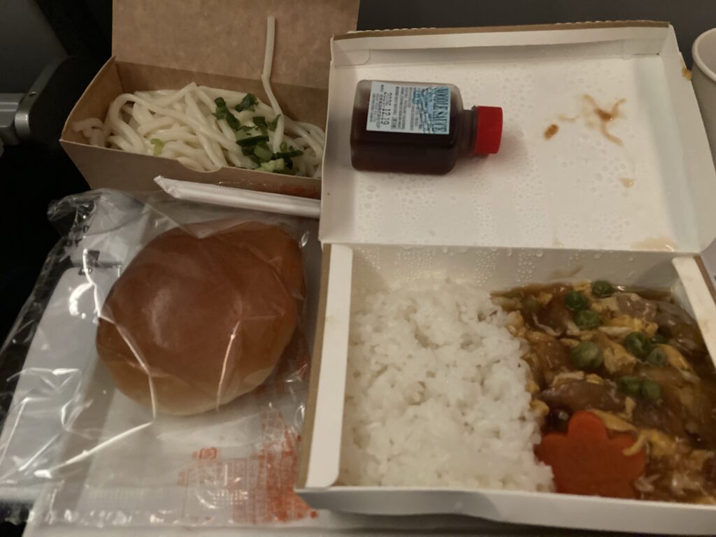 私たちの席は1番後ろだったので、機内食が配られるのも最後。それを待つ間もめちゃくちゃ眠たくて睡魔との闘いでした。