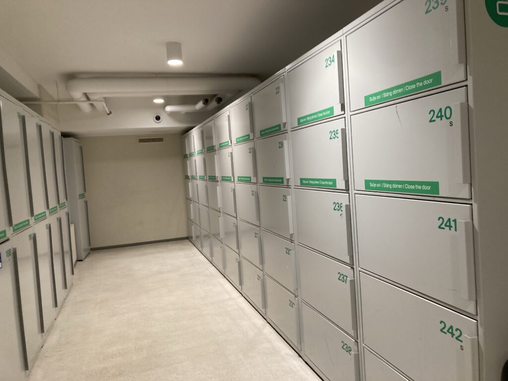 標識を見つけて、螺旋階段を降りたらロッカーがありました。大小のロッカーがあり、画面でサイズや時間を選んでクレジットカードで支払いしました。ロッカーナンバーは機械が決めて来ました。