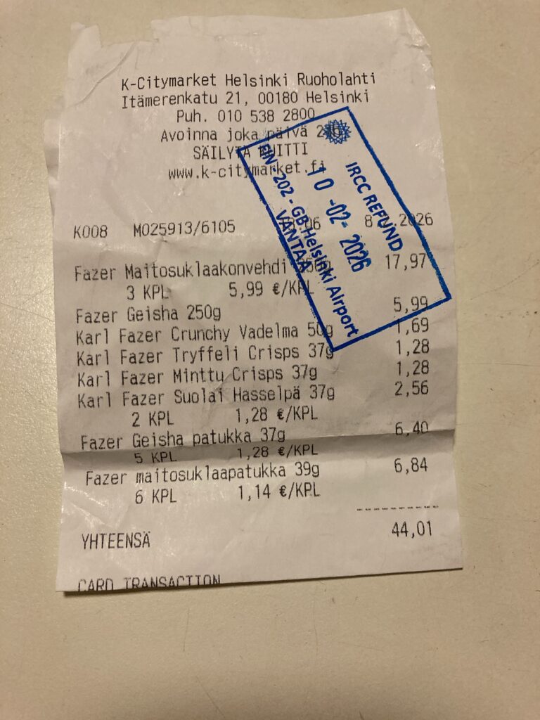 事前調べで免税が食品40ユーロ日用品40ユーロと、食品と日用品がそれぞれ免税対象として分けられていることが分かっていたので、チョコレートだけで40ユーロになるように計算しました。